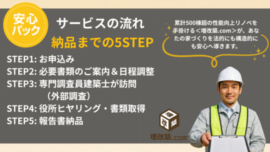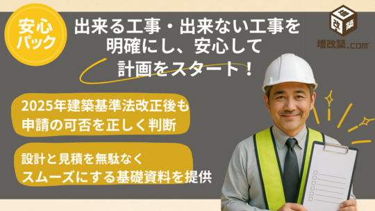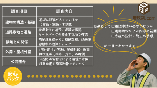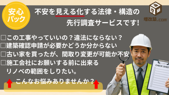 しかも、累計500棟超の性能向上リノベ実績を持つ〈増改築.com〉が監修、普段設計を担当している設計事務所が調査を行いますので、法律だけでなく現場目線のアドバイスも万全のサービスです。