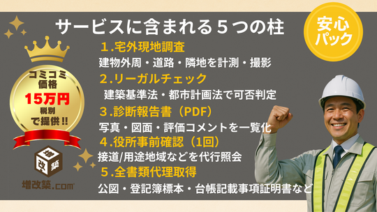 本サービスは、そんな“見えない法的リスク”を専門家が先回りして洗い出し、「できる工事/できない工事」を明快に線引きするための先行診断パックです。調査員が宅外から建物外周を測定し、道路幅員や隣地との離角、基礎の状態まで確認。さらに公図・登記簿を代理取得し、役所にも事前照会を行うことで、2025年の建築基準法改正後でも通用するリーガルチェックを完了させます。