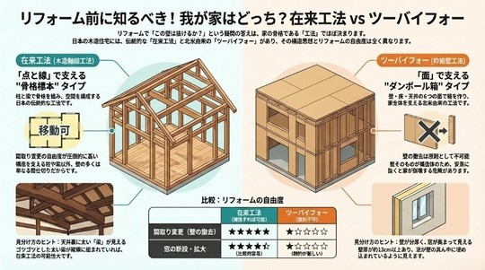 【リフォームの自由度が激変】在来工法とツーバイフォーの決定的違いとは?プロが教える、我が家の「見分け方」4選