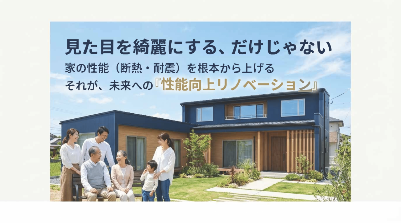 性能向上リノベーション(せいのうこうじょうりのべーしょん)とは:単に内外装を新しくするだけでなく、耐震性や断熱性といった、住宅の基本的な性能(パフォーマンス)を、現代の基準、あるいはそれ以上に向上させることを主目的としたリノベーションのこと。