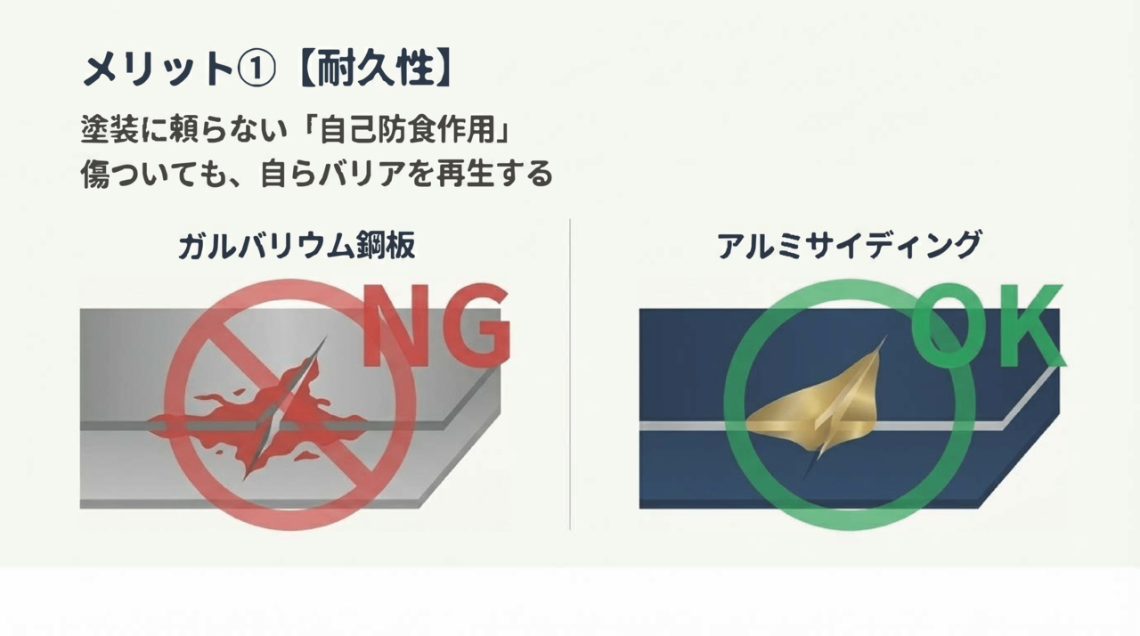 ガルバリウム鋼板の「メッキ」に頼る防錆と、アルミの「自然酸化被膜の形成」は、似て非なるものです。傷ついても自らバリアを再生する、塗装に頼らない真の耐久性とは何か。その科学的根拠を、プロとして誠実にお伝えします。