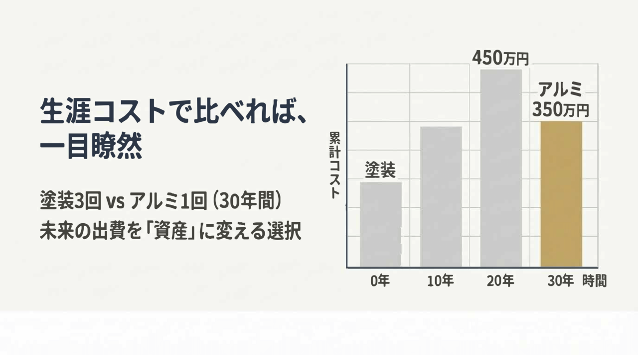 この視点に立つと、驚くべき真実が見えてきます。それは、初期費用が最も安い「塗装」が、結果的に最も高くつく選択肢になる可能性が非常に高い、ということです。
