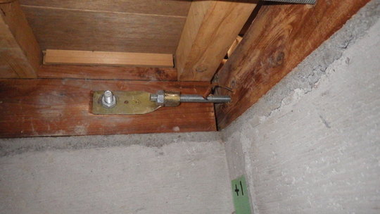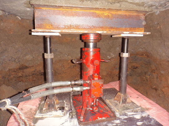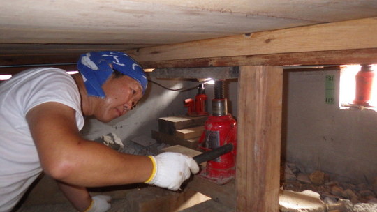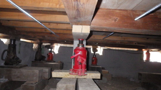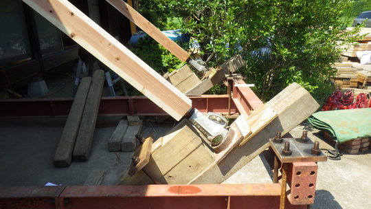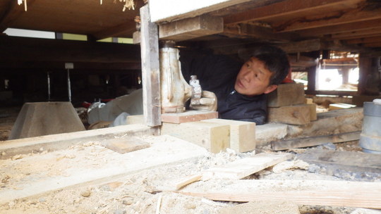 「軽い建物なら、アリだと思うんですが・・爪ジャッキは、実は土台の半分くらいにしか掛かっていないんですね。そのため、爪ジャッキを使うとどうしても土台がやや斜めに癖ついてしまうのと、その際にホゾも傷めるんで、それを避けたいんです」