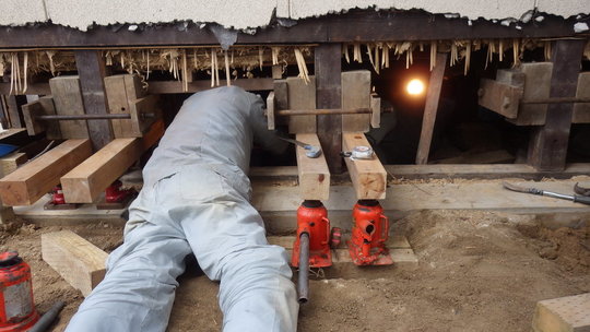 「そんなにもかかるんですか!うちとか隅の方が少し傾いているだけなんで、ちょっとジャッキ持って来てもらって揚げてもらえば良いかな。と思ってたんですが」