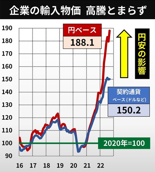 10月13日発表の9月企業物価指数では、2020年を100とした際に116.3となっており19か月連続で前年水準を上回る勢いとなっております。上の図は「上昇率」ではなく、「価格水準」のグラフとなっていてわかりやすいです。2022年の春以降の値上げは原材料の高騰が直撃していましたが、いまは円安が輸入コスト増が主因となりさらにコストが上がり続けているのです。価格でみると2020年の2倍に迫る勢いです。円安はその後も加速しておりますので、今後も値上げは段階的に続くとみるのが通常の見立てとなります。