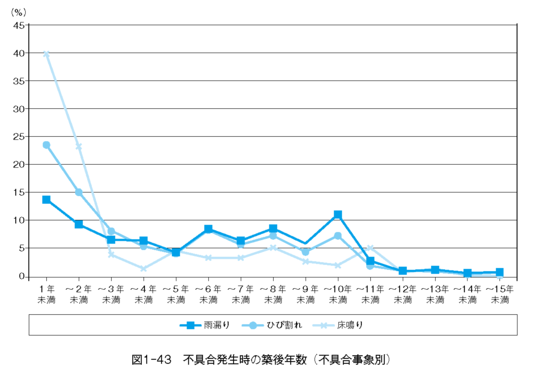 不具合発生時の築後年数は、新築等の相談が32%を占め2年目が次いで10%を占めて3年目以降は10年目までは5%を推移し10年目が6%と増加しそこからは少なくなります。10年目が増えているのは、瑕疵担保保険の年数が10年と区切られているためだと考えられます。