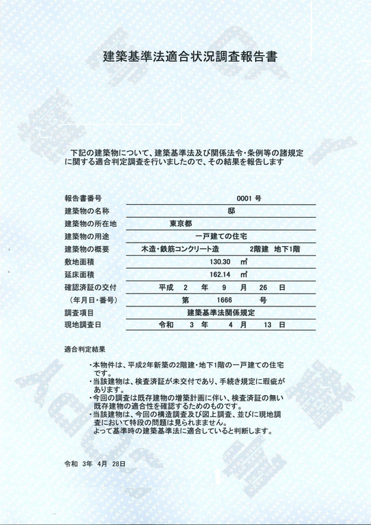 このようなケースでは、既存の建物が建築当時の法律に適合しているか否かのインスペクションを行う必要があり、その既存住宅適合調査報告書(建築基準法適合調査報告書)をもって初めて増築申請が可能となります。