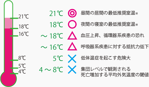 イギリスの保健省は、健康を維持するための推奨室温を21℃、許容できる室温を18℃としています 。そして、室温が16℃未満になると呼吸器系疾患に影響が出始め、9℃~12℃では血圧上昇や心血管疾患のリスクが高まると警告しています 。