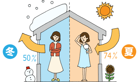 夏に外から入ってくる熱の74%、そして冬に室内から逃げていく熱の50%が、「窓」などの開口部を経由しています 。