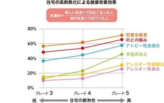 下のグラフは、断熱性能の高い家に転居した人が、以前の住まいで抱えていた症状がどれだけ改善したかを示したものです。断熱等級が上がるほど、気管支ぜんそく、アトピー性皮膚炎、のどの痛み、せき、アレルギー性鼻炎などの症状を持つ人の改善率が高くなっていることが分かります 。