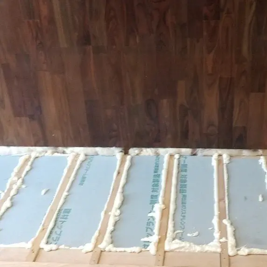 まず大前提として、床下からの冷気を完全にシャットアウトします。一般的なウレタンフォーム(30mm)ではなく、熱伝導率0.022W/m・Kを誇る高性能断熱材「ミラネクストラムダ」を、特注の75mm厚で根太間に隙間なく充填。さらに気流止めと防湿シートで、床下の影響を完璧に断ち切ります。