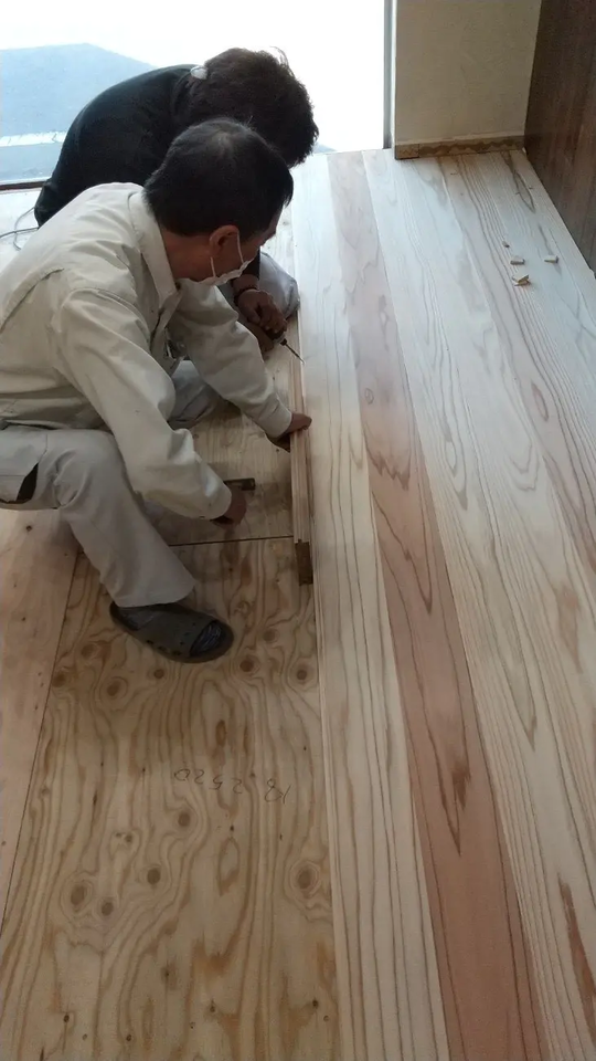 その上に、厚さ30mmの国産杉板を施工。一般的な合板フローリング(12mm)の2.5倍の厚みがあり、圧倒的な蓄熱量と温かさを確保します。