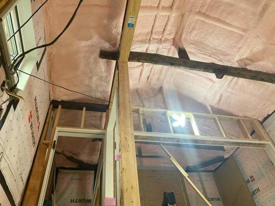 2. 折半屋根と梁の間にできる複雑な形状の隙間には、現場発泡ウレタンを吹き付け、気流と熱の通り道を完全に塞ぎます。
