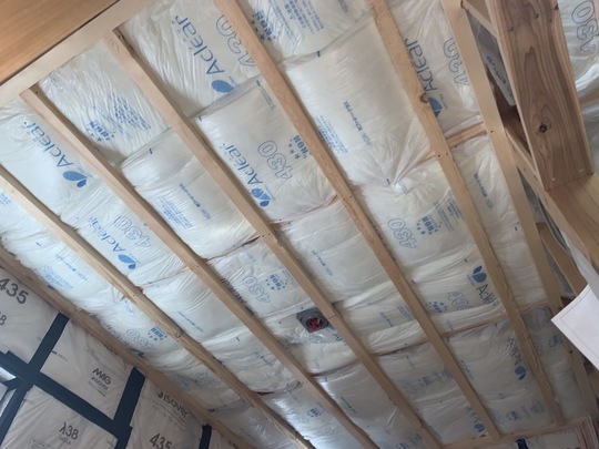 天井の骨組み(野縁)の間に、断熱材を隙間なく敷き詰めます。この時、断熱材を押しつぶすと性能が落ちるため、適切な厚みのものを選定します。