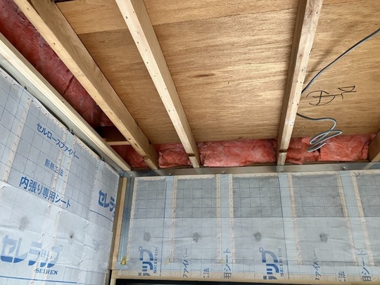 3. 主断熱の施工: 梁の被覆が終わった後、天井全体にセルロースファイバーなどを300mm以上の厚みで吹き込み、主となる断熱層を形成します。