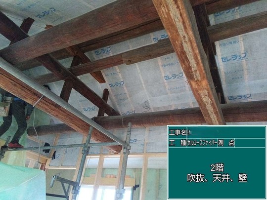 吹き抜け等空間に余裕があるとき300㎜の断熱層下地を屋根なりに組みセルr-巣ファイバーを充填