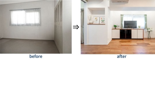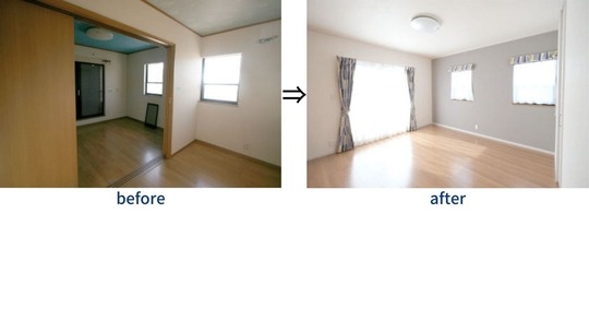 実施した施工内容は、二部屋の仕切り壁の撤去と内装の張替えです。