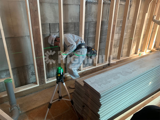 住宅密集エリアにおける悩みの一つに、お隣さんとの外壁と外壁の距離がほとんどなく、足場が建たないというケースがあります。このような時には、外壁を部屋側より解体し、かつ部屋うちから外壁を張る。外壁裏打ち工法がお勧めです。特殊工法になるため、出来る会社はかなり少ないと言えますが、木造改修ノウハウを持つ会社であればできる施工会社も存在します。長屋住宅のように、完全に躯体が一体化されている建物では構造躯体の切り離しを行わない限りできませんが、概ね150㎜以上の空間があれば施工が可能となるケースがあります。