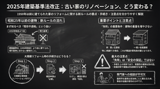 この背景には、既存不適格住宅をあまりにも厳密に現行基準へ適合させると、改修自体が不可能になってしまうという現実的な問題があります。戦前・戦中からの古い建物を、いまの耐震基準に完全に当てはめようとすれば、解体再建に近い大工事になりかねません。