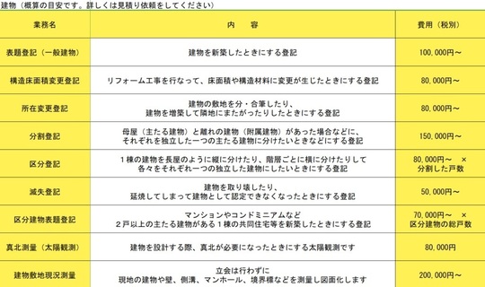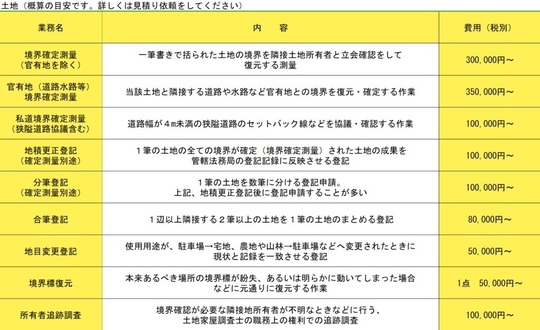 土地家屋調査士事務所に依頼した際は以下の費用がかかります。費用は業務の内容、対象の大きさ、筆数によって異なります。