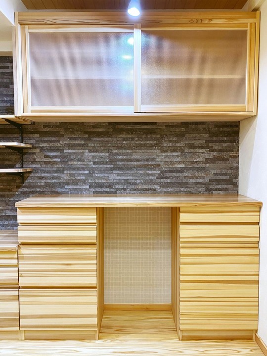 接客スペースに雰囲気を出すためにカップボードやローボード、TVボードも杉材で造作しました。