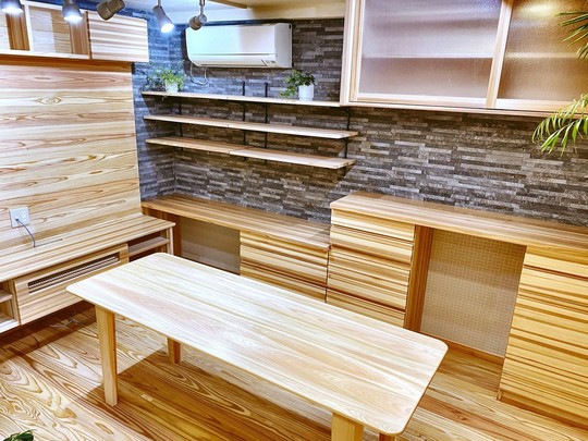 改修後は、30㎜杉板となり展示用に杉を使いTVボード、ローボード、カップボードを家具造作しています。テーブルはヒノキで造作しています。
