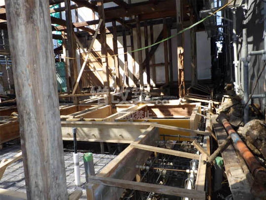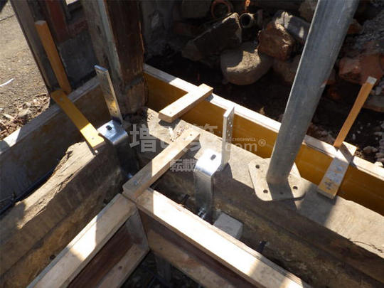 ▲既存の大谷石部分は、両サイドから基礎を立ち上げ補強します。柱脚部へは予め補強金物を打ち込み基礎と土台柱が連結され一体化されます。