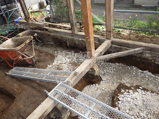 ▲鋤取り後指定の基礎補強部へ根切を行います。