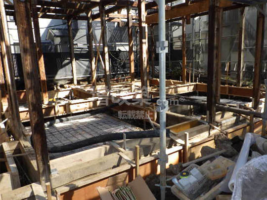 ▲長屋の切り離し部の基礎新設。アンカーボルトは土台設置時に固定します。