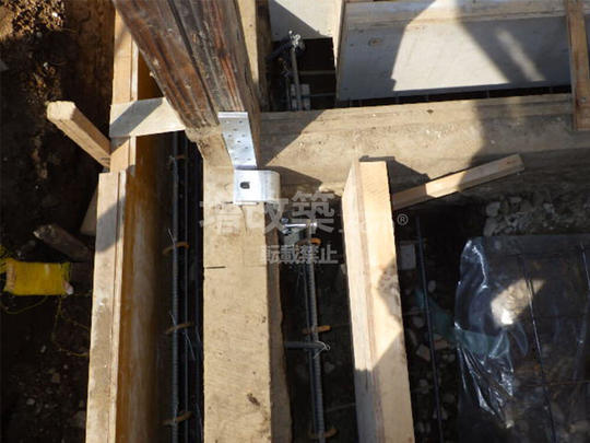 ▲木工事時に新たに新設される柱の位置へも同様にコンクリートで一体化される前に金物を埋め込みます。