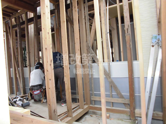 解体が終わると「裏打ち工法」工事に入っていきます。ポイントは450㎜ピッチで間柱を仮設置する工程です。外壁材を内側より設置するために、間柱へひっかけ金物を設置しますが、いざ搬入の際には固定してしますと、外壁材が室内側より搬入が出来ないため、仮設置し、搬入時は外しながら部屋うちより外装材を設置するためです。