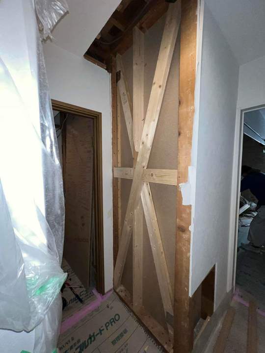 多くの施主様がまず最初に驚かれるのが、この内部ハーフスケルトンの“やり方”です。たしかに、階段や二階床を残すなら“フルスケルトンほど大がかりではない”と思うかもしれません。しかし実際には、筋かいや面材を取り付けるために内壁を徹底的に解体するので、住まいの印象はほぼ“骨組みむき出し”の状態に近い大工事になります。