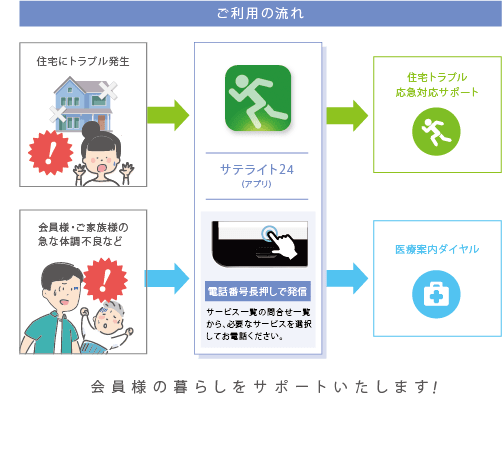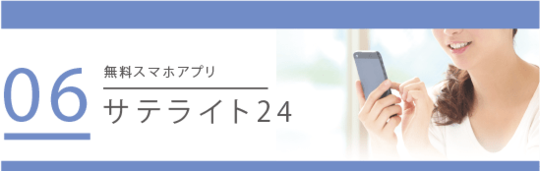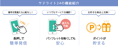 サテライト24は、会員様がサービスをもっと手軽に快適にご利用いただけるよう開発したスマートフォンアプリです。アプリならパンフレットをなくしてしまっても、サービスの内容のご確認や各種サービスへ簡単にお問合せ(サービスへお電話)いただくことができます。