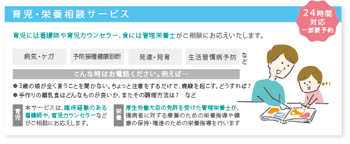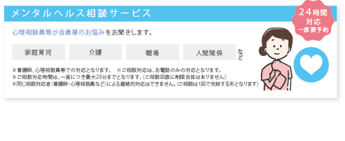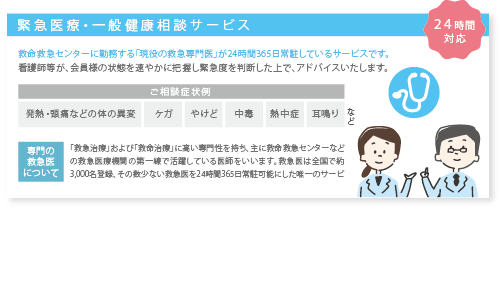 突然の病気やケガなど緊急時の対処方法、休日や深夜の病院・診療所などのご案内、健康相談など、24時間365日受付し会員様をサポートいたします。
