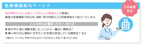 ※本サービスは緊急時の対応や医療機関等、医療に関する一般的な情報を提供するサービスです。救急車・救急病院の手配、予約、その他診療・医療・緊急医療行為等のサービスではございません。
