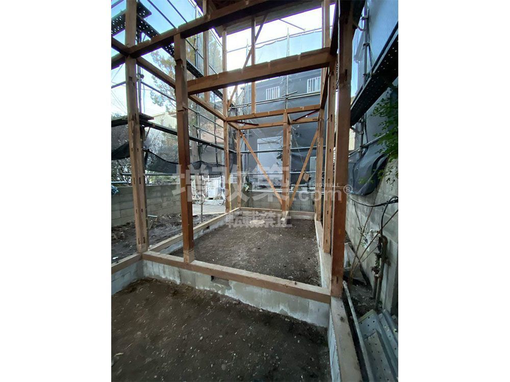 既存の間柱までは解体し、既存の基礎と木構造体のみの躯体残しの状態となりました。
