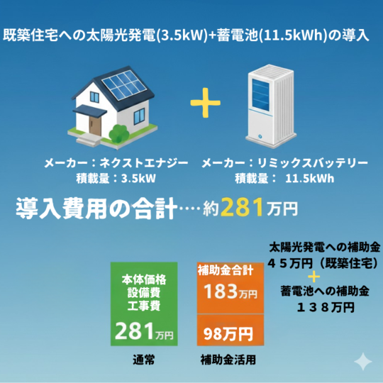 助成金合計:1,740,000円(蓄電池138万 + 太陽光36万)
