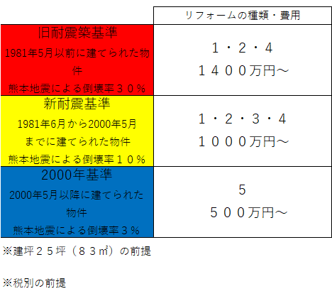 5つのフルリフォームパターンを「旧耐震基準」「新耐震基準」「2000年基準」に振り分けた表
