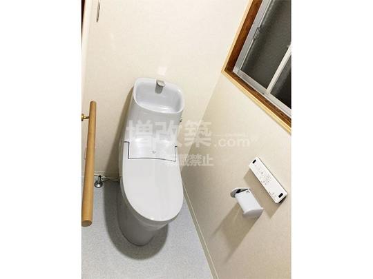 トイレは既存は和式でしたが洋式トイレへ。リクシル ベーシアシャワートイレ(フチなし)。手摺も取り付け安心です。
