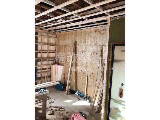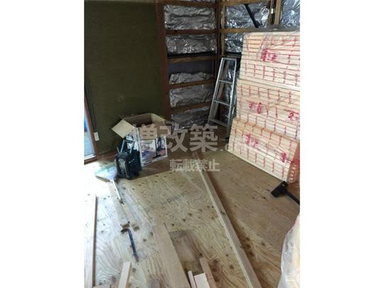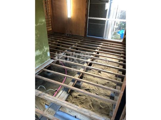 天井・壁解体後。床断熱を施工するため、コンパネを撤去します。解体直後に新たな床組みをした時点で、防蟻処理を行います。