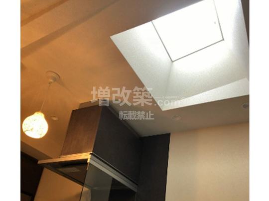 彩光の関係でキッチン前の天井に明かり窓を設置する事で、昼間でも照明器具が無くても過せるように提案しました。