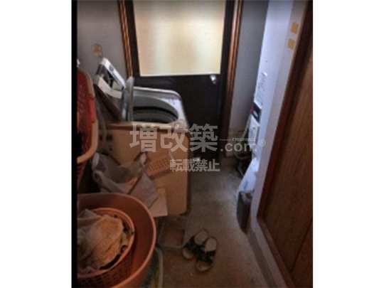 勝手口通路に設置された洗濯機、廊下から一段下がった土間に置いてあり出入りの危険性があります