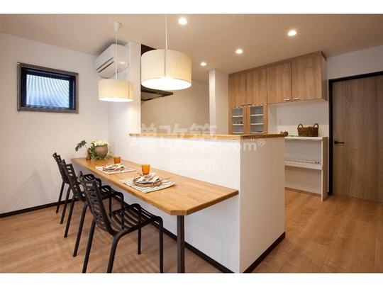 キッチンスペースですが、リノベーション前は北東の一番隅に追いやられいましたが、スケルトンリフォームをすることで間取りの自由度が上がり住宅の中央部分に配置し、念願の対面キッチンに生まれ変わりました。今まで一番薄暗い場所にありました家族団らんの中心になるように配置し、普段の家族の行動が把握できるようにいたしました。