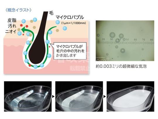 水と空気でできた超微細な気泡が、肌のすみずみまでの汚れや毛穴の奥の老廃物等に付着し浮き上がらせるほか、気になるニオイの元も洗い流します。