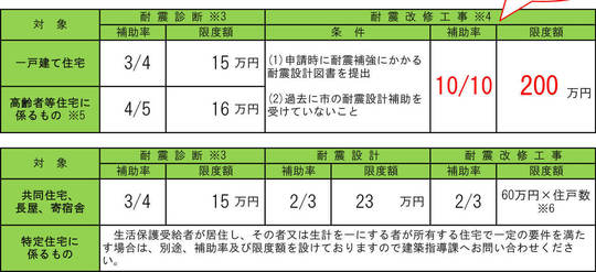 ※4 耐震改修工事:過去に市の耐震設計補助を受けている場合は、別途、補助及び限度額を設定しておりますので、建築指導課までご相談ください。