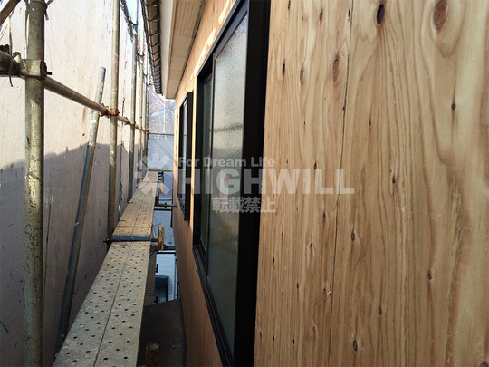 全体に構造用合板を貼り、サッシが入る箇所は仮止めで止めています。