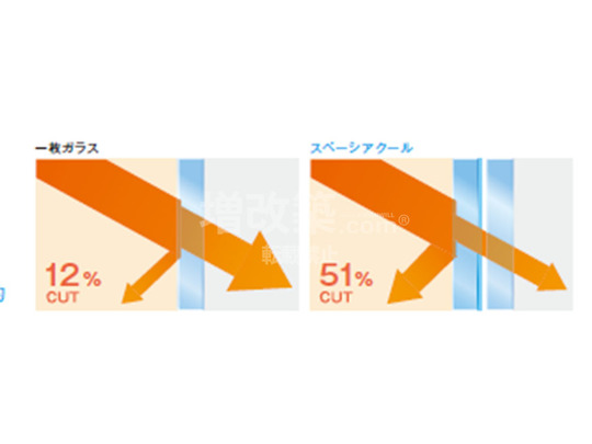 お部屋の厚さの原因となる太陽熱を51%カット。1枚ガラスの約4倍の遮熱性能で冷房の効果を高め、いつでもお部屋は快適です。