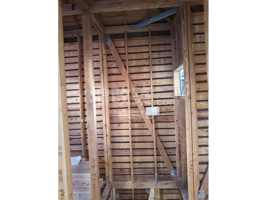 ▲解体工事で解体していない主要構造部の柱などを解体し、火打ち金物など水平面の補強金物で補強できるところを補強していきます。