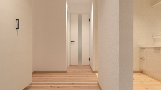 壁紙の選択: 壁紙には珪藻土クロスを採用しました。珪藻土クロスは、その自然な質感と調湿機能で人気があります。また、各出隅や入隅には杉材を使用し、珪藻土クロスの割れやすい弱点を補完しました。この工夫により、美観と機能性が高められ、長期的な耐久性が確保されました。