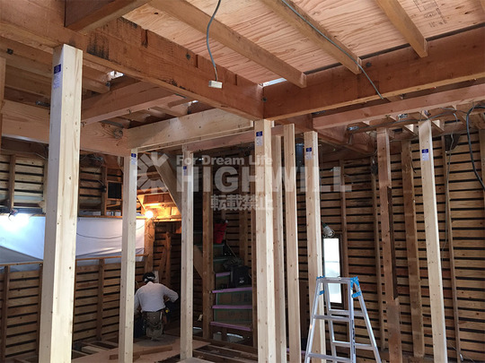 解体後のザラ板補修も終わり、S様邸一戸建て2世帯スケルトンリフォームも本格的な木工事に入っていきます。家がゆがんでいる原因は過度な荷重が一部の構造材にかかっているためであり、今回の工事では、荷重の分散が大事になってきます。